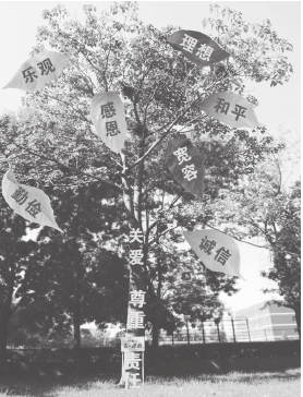 從某種意義上說,人的成長(zhǎng)與樹的生長(zhǎng)有相似之處。因此,我們用一棵樹來表示十個(gè)基本的價(jià)值品質(zhì)的關(guān)系。我們把樹分為樹干和左、右三部分,把十個(gè)基本價(jià)值品質(zhì)也大致分為三組,其中以“尊重”與“責(zé)任”為核心。設(shè)計(jì)這棵樹的靈感源自種植于我校校園內(nèi)的天津經(jīng)濟(jì)技術(shù)開發(fā)區(qū)的第一棵樹,因此,這個(gè)設(shè)計(jì)也具有濃郁的地方特色和深刻的象征意義。