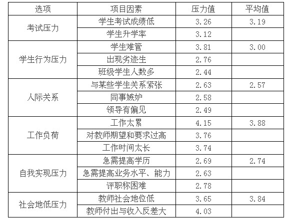 教師的自我實(shí)現(xiàn)壓力較大。從心理學(xué)角度來(lái)看,中學(xué)教師有著強(qiáng)烈的成就動(dòng)機(jī),但由于多種原因,其成就動(dòng)機(jī)常常受阻,導(dǎo)致出現(xiàn)挫折感并引起一定的心理壓力。