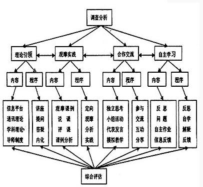 外語教師的培訓(xùn)有別于其他的培訓(xùn),在培訓(xùn)模式上各位學(xué)人也做了很多有益的探索。外語教師的培訓(xùn)要想不流于形式,就應(yīng)該體現(xiàn)“開放、互動(dòng)、創(chuàng)新、反思”的設(shè)計(jì)思路,并應(yīng)遵循針對(duì)性、整合性、參與性、活動(dòng)性幾個(gè)原則。也就是說,培訓(xùn)內(nèi)容緊緊圍繞英語新課程有關(guān)的問題,引導(dǎo)參培者針對(duì)自己在實(shí)施新課程過程中可能遇到的困難和困惑進(jìn)行探討;理論學(xué)習(xí)與實(shí)踐緊密結(jié)合,相互參透,通識(shí)性培訓(xùn)中的理論應(yīng)盡可能地使用具體的學(xué)科實(shí)例進(jìn)行闡釋;培訓(xùn)模式充分體現(xiàn)大家參與的和諧、愉快的學(xué)習(xí)氣氛,培訓(xùn)者與參培者的角色發(fā)生變化。培訓(xùn)者由“知識(shí)的傳授者”成為參與者的“指導(dǎo)者”、“協(xié)作者”;傳統(tǒng)意義上的“培訓(xùn)對(duì)象”、“受訓(xùn)者”成為“參與者”,“參培教師”主動(dòng)參與培訓(xùn);參與者不僅進(jìn)行理論探討,還要通過大量的實(shí)踐活動(dòng)親身體驗(yàn)新課程的改革思想、內(nèi)容和措施,從而使自己的思想和行為發(fā)生根本的變化。具體的培訓(xùn)模式,應(yīng)該以科學(xué)系統(tǒng)的教育理念和學(xué)習(xí)理論為依據(jù),結(jié)合英語新課程標(biāo)準(zhǔn),在整合優(yōu)化不同培訓(xùn)的方式上,針對(duì)成人教育的特點(diǎn),建構(gòu)融合教學(xué)各個(gè)層面的微觀教學(xué)方式,就是采用“互動(dòng)學(xué)習(xí)+自我反思式”、“動(dòng)態(tài)督導(dǎo)+策略訓(xùn)練式”、“理論拓展+課題研究式”為一體的、適應(yīng)時(shí)代要求的多元化外語教師教育方式,從而使受教育者在動(dòng)態(tài)的知識(shí)建構(gòu)中提高教學(xué)理論水平,培養(yǎng)自身的專業(yè)素質(zhì)和自主發(fā)展能力。也可以采用由王楓杯等設(shè)計(jì)的相互獨(dú)立又彼此聯(lián)系的,在“調(diào)查分析”模塊的基礎(chǔ)上,由“理論引領(lǐng)”、“觀摩實(shí)踐”、“合作交流”、“自主學(xué)習(xí)”這四大“過程板塊”和一個(gè)訓(xùn)后“綜合評(píng)價(jià)”板塊組成的教師培訓(xùn)模式。如圖1所示;