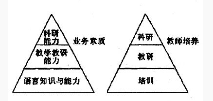 也有人認(rèn)為,外語教師的培訓(xùn)可以采用“三位一體模式”,包括培訓(xùn)、教研、科研三個(gè)組成部分。教師培養(yǎng)的模式是依據(jù)教師業(yè)務(wù)素質(zhì)要求構(gòu)建的,教師業(yè)務(wù)素質(zhì)的三個(gè)主要板塊是語言知識(shí)和語言能力、教學(xué)教研能力和科研能力。三者的關(guān)系及所占份額呈金字塔形,因此,教師培養(yǎng)三位一體模式也呈金字塔形。