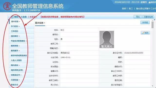 登錄成功后界面如下圖:左邊各項內(nèi)容由教師本人依據(jù)證件及文件精神如實、準確填寫。
