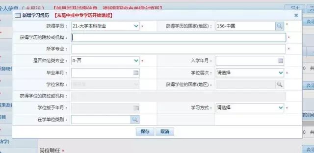 例如,某老師現(xiàn)學歷為博士研究生的,一般要至少生成4行學習經(jīng)歷(高中、專/本科、碩士、博士),請按順序由低到高增加。每增加一行信息,填完后需點“保存”。