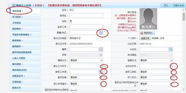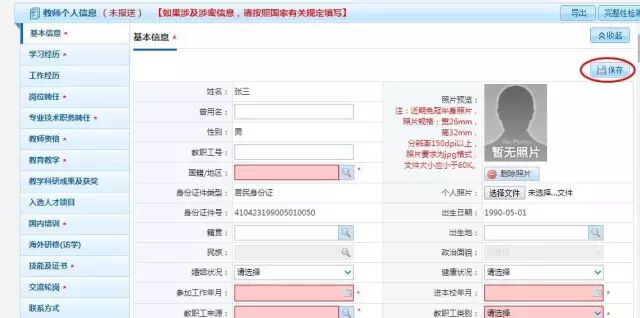 說明1: 標注星號的項目為教育部要求必填項目。如未按照要求填寫,系統(tǒng)內(nèi)將無法生成正確的個人信息檔案,會影響日后職稱晉升、人事調(diào)動、離退休等一系列手續(xù)辦理,望慎重對待。