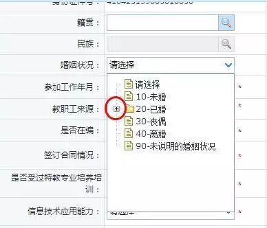 有些下拉選項要分級選擇。如“婚姻狀況”下圖中可點擊"已婚“選項前的”+“號。
