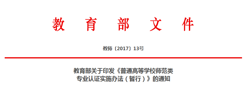 為貫徹落實黨的十九大精神,培養(yǎng)高素質(zhì)教師隊伍,按照國家教育事業(yè)發(fā)展“十三五”規(guī)劃工作要求,推進教師教育質(zhì)量保障體系建設(shè),提高師范類專業(yè)人才培養(yǎng)質(zhì)量,我部決定開展普通高等學校師范類專業(yè)認證工作?,F(xiàn)將《普通高等學校師范類專業(yè)認證實施辦法(暫行)》印發(fā)給你們,請結(jié)合實際認真貫徹執(zhí)行。