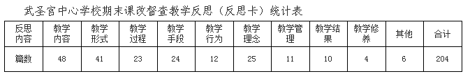 提到反思的內容,大多數教師會認為就是教學內容,寫的反思,內容也是如此。其實,這只能算是狹義的反思。那廣義的反思從內容來看有哪些?本人覺得,反思應包括教學內容、教學形式、教學過程、教學手段、教學行為、教學理念、教學管理、教學結果、教學修養(yǎng)等。如:武圣宮中心校期末課改督查教學反思統(tǒng)計表,現(xiàn)舉四例加以說明。