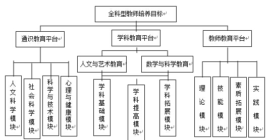 在學(xué)科教育平臺的設(shè)計上,突出能力教育為主體,將全科型教師的學(xué)科教育分為相輔相成的兩個階段。其中,以人文教育為主的教學(xué)方向,前兩年以人文與社會科學(xué)概論為基礎(chǔ),以人文社會科學(xué)史綱、藝術(shù)發(fā)展史為輔助,側(cè)重對漢語言文學(xué)、思想政治教育、歷史學(xué)、地理科學(xué)和藝術(shù)的學(xué)習(xí),以達到對人和社會的總體認識,并通過藝術(shù)學(xué)習(xí)陶冶情操;以數(shù)學(xué)和科學(xué)教育為教學(xué)方向,前兩年則以自然科學(xué)概論為基礎(chǔ),以自科學(xué)技術(shù)史為輔助,側(cè)重對數(shù)學(xué)、物理、化學(xué)、生命科學(xué)和地學(xué)的學(xué)習(xí),以達到對自然的總體認識。從第五學(xué)期開始,各個方向則根據(jù)學(xué)生個性發(fā)展的要求,自主選擇分領(lǐng)域的深入學(xué)習(xí)與研究。開設(shè)雙語教學(xué)課程,拓寬全科型教師的國際視野,適應(yīng)我國農(nóng)村發(fā)展、城鎮(zhèn)化建設(shè)和對外開放的文化發(fā)展需要。