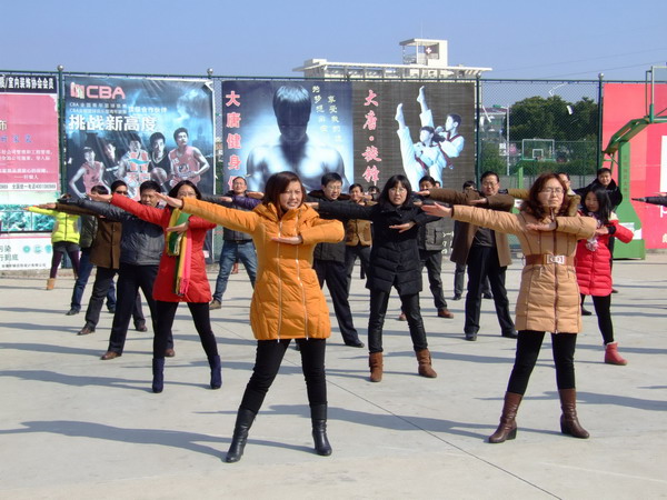 雖然籃球場(chǎng)上風(fēng)很大,天很冷,但教師們卻沒(méi)有絲毫畏縮,一如在課堂上全身心投入工作的態(tài)度,認(rèn)真學(xué)習(xí)每一個(gè)動(dòng)作。經(jīng)過(guò)上下午兩個(gè)多小時(shí)的學(xué)習(xí),絕大部分教師都能跟上節(jié)拍,獨(dú)自完成動(dòng)作。