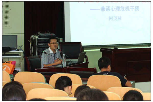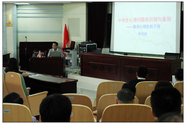 隨后,柯茂林博士深入淺出、圖文并茂地分析了中學(xué)生心理問題的識(shí)別與鑒別的重要作用。在講座中,他針對(duì)當(dāng)前中學(xué)生普遍出現(xiàn)的一些心理問題進(jìn)行理論聯(lián)系實(shí)際的講解。對(duì)于我們常說(shuō)的“早戀”,柯博士分析其實(shí)很多的時(shí)候只是配對(duì)活動(dòng),對(duì)這類問題上策是疏而不堵。柯博士還幫我們區(qū)分了“網(wǎng)癮”與網(wǎng)絡(luò)不當(dāng)使用,他認(rèn)為辯證思維和親情維護(hù)是對(duì)付網(wǎng)絡(luò)不當(dāng)使用的兩大法寶。而對(duì)自卑、抑郁心理的識(shí)別柯博士用了一個(gè)生動(dòng)的案例告訴老師們應(yīng)以家庭為切入點(diǎn)來(lái)體現(xiàn)呵護(hù)和關(guān)懷,更提醒我們關(guān)注“好孩子綜合癥”。中學(xué)生臨考常有的焦慮心理的問題上,他主張治療家庭焦慮是關(guān)鍵,必要時(shí)尋求專業(yè)幫助。而對(duì)于較為嚴(yán)重的精神病性心理,他分析了其常見跡象,并給出建議:細(xì)心觀察細(xì)節(jié)征兆并及早就醫(yī)。