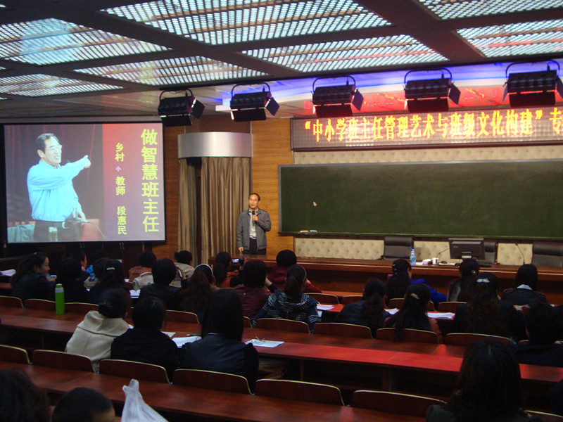 會(huì)議期間,“河南省師德先進(jìn)個(gè)人”、“ 全國十佳班主任”段惠民老師做了《追求教師職業(yè)幸!返难葜v;“全國模范教師”、“全國優(yōu)秀班主任”郭玉良老師做了《來自心靈的呼喚—問題學(xué)生的教育策略》的主題報(bào)告;“全國優(yōu)秀班主任”張勝利通過《班級(jí)主流文化的魅力》向老師們暢談如何構(gòu)建班級(jí)文化和班級(jí)文化的力量,并展示了一節(jié)別開生面的示范班會(huì)課供老師們觀摩。他們通過生動(dòng)幽默、充滿激情的語言,運(yùn)用理論與實(shí)際相結(jié)合的方式,在如何做一個(gè)幸福、快樂、有成就的班主任、如何創(chuàng)建特色班級(jí)文化、如何促進(jìn)孩子們的成長、如何提升職業(yè)幸福感等內(nèi)容進(jìn)行了詳細(xì)闡述,并將自己多年來的班主任工作經(jīng)驗(yàn)和心得與在場的班主任進(jìn)行了交流分享,指導(dǎo)大家要認(rèn)真學(xué)習(xí)并研究班級(jí)管理藝術(shù),促進(jìn)學(xué)生養(yǎng)成良好的心理品質(zhì)。