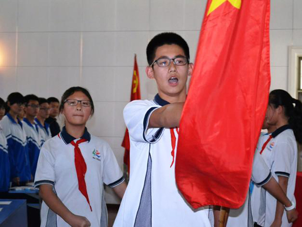 初一年級(jí)的4名家長(zhǎng)、教師和學(xué)生代表,在配樂(lè)朗誦《告別童年 走向青春》中,引領(lǐng)全體學(xué)生回顧、告別難忘的童年,激勵(lì)學(xué)生要心懷夢(mèng)想、勇挑重?fù)?dān),肩負(fù)時(shí)代賦予的責(zé)任,在青春的旅程上為夢(mèng)想、為祖國(guó)奮勇向前。全體學(xué)生充滿懷念和感激地向隊(duì)旗敬最后一個(gè)隊(duì)禮,將陪伴他們成長(zhǎng)的紅領(lǐng)巾鄭重珍藏在印有昌平二中校標(biāo)的信封中,標(biāo)志著從此告別童年、告別少先隊(duì),步入青年的行列。