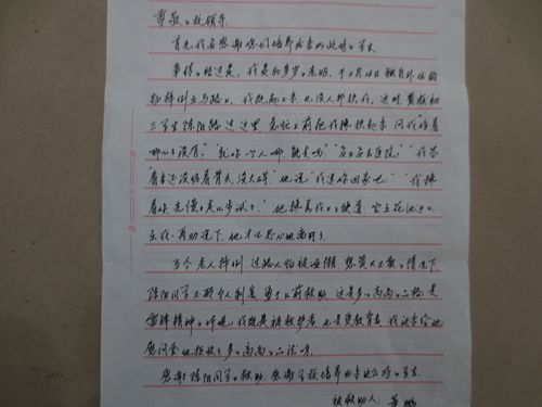 這件事發(fā)生在2月16日,也是開學(xué)的第一天,這天初三(3)班陳陽同學(xué)到學(xué)校報(bào)到,大約十點(diǎn)鐘左右放學(xué)回家,放下書包,準(zhǔn)備去物美超市買東西,走出大院門口,穿過一條馬路,突然,看見一位老奶奶摔倒在地上,周圍有許多人,沒見一個(gè)人扶,他趕忙上前,慢慢的把老奶奶扶起來,看見老奶奶額頭蹭破的皮,急忙詢問老奶奶有沒有事,并要求給老奶奶送到超市,奶奶說:“我沒事,我自己能走,謝謝你!”看見奶奶眼里含著感激的淚花,他還是決定將奶奶送到超市,走了大約20多米遠(yuǎn),奶奶說走累了,并要求休息,于是就把奶奶扶到了臺(tái)階上坐著,于是奶奶就讓他走,他便很牽掛離開了。