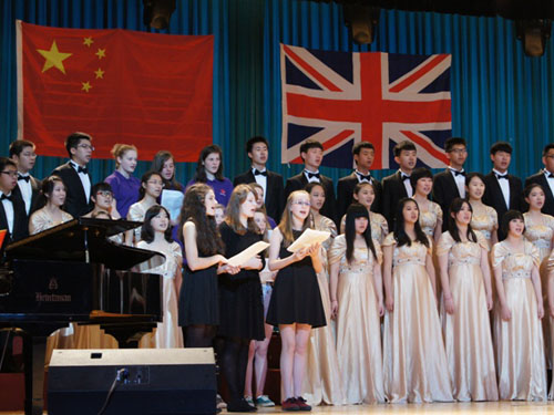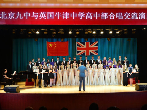 上午10時許,北京九中與牛津中學(xué)高中部合唱團(tuán)在石景山區(qū)青少年活動中心金鵬劇場進(jìn)行合唱交流演出,演出主題為“歌聲與微笑”,石景山區(qū)教委副主任聶晶、區(qū)教委副調(diào)研員管娜、區(qū)教育分院院長趙士雪、九中集團(tuán)成員學(xué)校領(lǐng)導(dǎo)、學(xué)生家長及新疆部學(xué)生觀看表演。演出前北京九中黨總支書記呂麗致歡迎詞,中英雙方互贈禮物。演出以雙方合唱英文歌曲《As long as I love music》拉開序幕,隨后九中合唱團(tuán)為觀眾們獻(xiàn)上《軍港之夜》、《南屏晚鐘》、《杵歌》等歌曲,牛津中學(xué)小合唱隊也演唱了電影《修女也瘋狂》中的三首插曲,獲得九中師生及家長們的熱烈掌聲。交流演出在由中英雙方合作演唱的《歌聲與微笑》中到達(dá)高潮,全場觀眾隨著歌聲有節(jié)奏地拍起手來,一起為合唱團(tuán)精彩的表演喝彩。