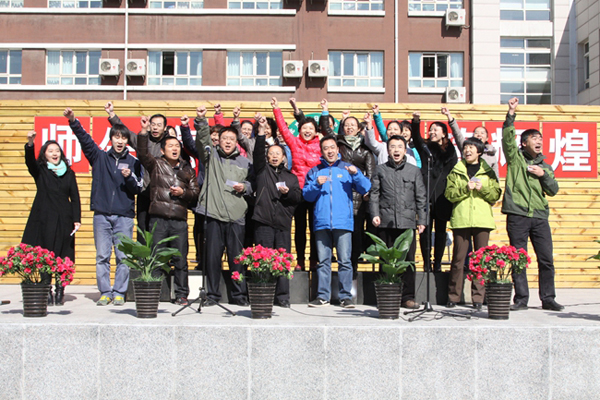 師生們鏗鏘有力的誓言在校園上空久久回蕩!師生們?nèi)呵檎駣^,斗志昂揚(yáng)!