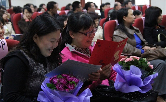 22日下午4時(shí)40分,我校第二屆班主任節(jié)在初中部學(xué)生稚嫩而飽含深情的配樂(lè)詩(shī)朗誦中拉開(kāi)了帷幕,校合唱隊(duì)也獻(xiàn)上了精心準(zhǔn)備的歌曲《每當(dāng)我走過(guò)老師的窗前》,高二學(xué)生于小晴代表全體學(xué)生向各位班主任表示感謝。令每一位班主任意想不到的是:每一個(gè)班級(jí)都有學(xué)生代表來(lái)到了現(xiàn)場(chǎng),獻(xiàn)上了親手制作的賀卡和溫馨的祝福。