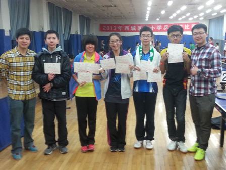 我校乒乓球隊在11月23日舉辦的2013年西城區(qū)中小學乒乓球比賽中獲得佳績!五名隊員共斬獲男雙冠軍、女雙冠軍、混雙冠亞軍、女單冠亞軍、男單亞軍、季軍、殿軍,包攬5項單項賽的4項冠軍,幾乎將所有獎項收入囊中!