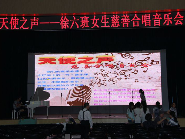 “用愛編織音樂,將音樂以愛的方式傳遞給需要幫助的人。”5月19日下午五點“天使之聲——徐六班女生慈善合唱音樂會”在學校體育館如期舉行。11位女生合唱的《圣母頌》,營造出了一種高雅圣潔的氛圍,使觀眾如同置身于中世紀古樸而肅穆的教堂之中!蹲右箙歉琛凡捎昧恕翱ㄞr”的演唱的方式,每一個聲部的進入都較之前一個聲部錯后一個小節(jié),由齊唱進入,發(fā)展至二聲部、三聲部直至六聲部。聲部的疊加增強了音響效果和層次,激發(fā)聽眾的情感共鳴!队成郊t》優(yōu)美的旋律、深情的歌詞,表達了人們對紅軍的熱愛,對英雄的崇敬……