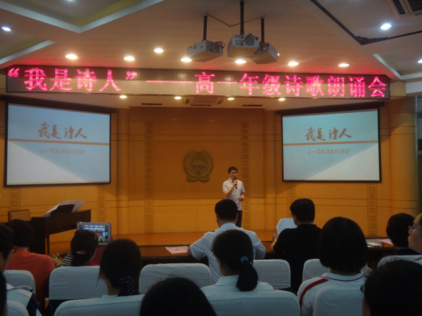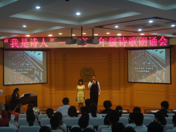 2014年5月19號(hào),“我是詩(shī)人”——北京育才學(xué)校高一年級(jí)第十一屆詩(shī)歌朗誦會(huì)在階梯教室隆重舉行。本次詩(shī)歌朗誦會(huì)以班級(jí)比賽的形式展開(kāi),整個(gè)流程分為三輪比賽,第一輪比賽是現(xiàn)代詩(shī)朗誦,8個(gè)班級(jí)晉級(jí)6個(gè);第二輪比賽是古典詩(shī)朗誦,6個(gè)班級(jí)晉級(jí)3個(gè);第三輪比賽是原創(chuàng)詩(shī)朗誦,3個(gè)班級(jí)進(jìn)行排位賽,得出最后的名次。經(jīng)過(guò)激烈的競(jìng)爭(zhēng),高一(7)班、高一(1)班、高一(8)班最后分別獲得了一、二、三名。在比賽過(guò)程中,朗誦節(jié)目形式多樣,有獨(dú)誦、群誦;有現(xiàn)場(chǎng)樂(lè)器伴奏、伴舞;有組詩(shī)、小詩(shī)劇……在競(jìng)爭(zhēng)的壓力下,同學(xué)們的表演極其投入,堪稱專業(yè),給全年級(jí)師生貢獻(xiàn)了一場(chǎng)絕美的詩(shī)歌盛宴。