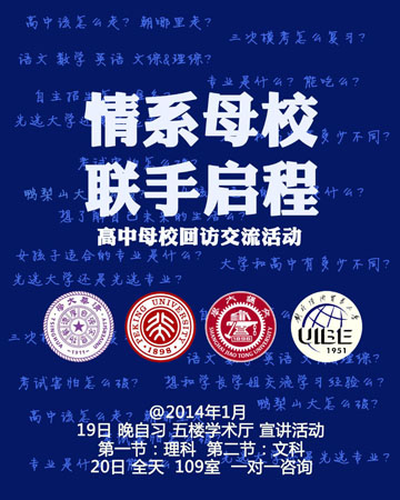 本著向母校的學(xué)弟學(xué)妹們解答高中生活中遇到的學(xué)習(xí)及心理方面的問題以及簡要介紹大學(xué)生活的目的,我們“情系母校,聯(lián)手啟程”聯(lián)合活動組將于2014年1月19日、20日分兩天在兵團二中高中部舉行交流活動。主要活動內(nèi)容有: