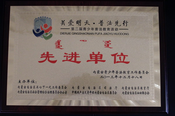 自治區(qū)青少年普法教育先進(jìn)單位獎牌