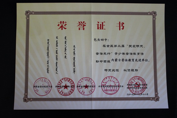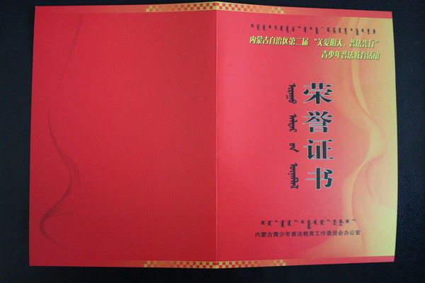 自治區(qū)青少年普法教育先進(jìn)單位證書