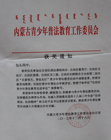 我校為做好“平安校園”創(chuàng)建工作,落實(shí)“六五“普法教育,在學(xué)校內(nèi)深入開展“關(guān)愛明天、普法先行”法制教育專題活動,系列法制教育活動的開展即加強(qiáng)了學(xué)生的法制教育,又得到社會各界的認(rèn)可,經(jīng)盟市教育局的推薦,我校獲取了“自治區(qū)青少年普法教育先進(jìn)單位”的榮譽(yù)稱號。