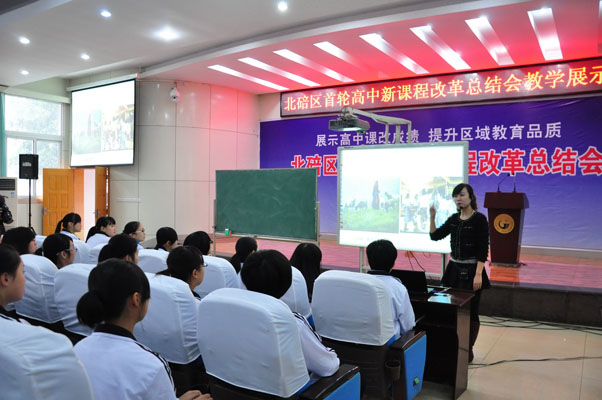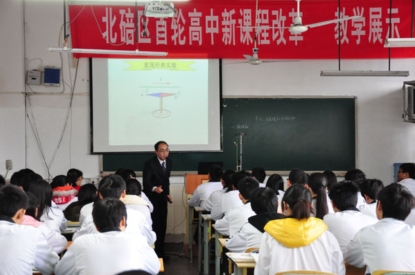 2013年11月6日,重慶市北碚區(qū)首輪高中新課程改革總結會在重慶市江北中學順利召開。本次大會由“成果展示、課堂觀察、小組研討、論壇交流、專家點評和領導講話”六個部分組成。與會的專家、領導,首先是深入課堂一線,認真觀察由北碚區(qū)八所高完中所提供的語文、數(shù)學、音樂等8堂不同學科的課堂。