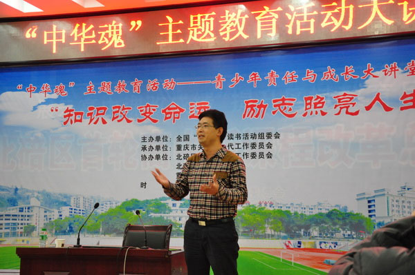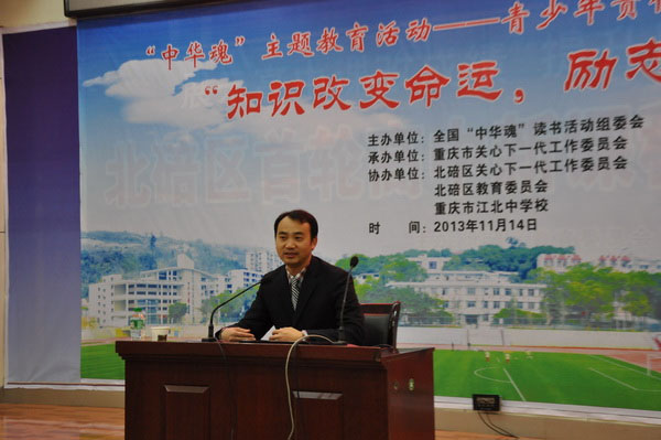 2013年11月14日,由重慶市關(guān)心下一代教育工作委員會主辦的“中華魂”大講堂——“知識改變命運,勵志照亮人生”主題報告會在我校舉行。原重慶市教委副主任、重慶市關(guān)工委副主任劉麗俐、北碚區(qū)關(guān)工委秘書長柳宗蓉、副主任張偉、北碚區(qū)教委副主任饒英、北碚區(qū)教委關(guān)委秘書長蒲倫等領(lǐng)導(dǎo)同志出席此次報告會。此次報告會的主講人員清華神廚張立勇老師。我校高三學(xué)子和部分老師認真聆聽了“清華神廚”的精彩報告。