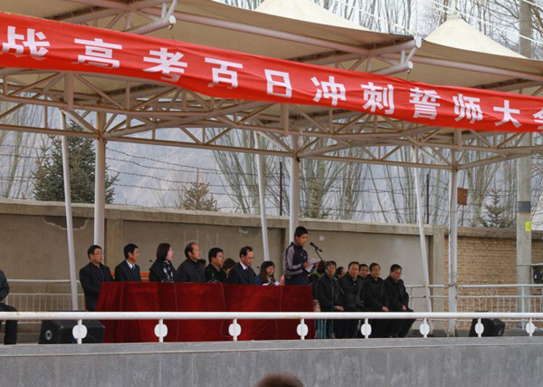 接著,孫丹丹老師代表高三全體老師進(jìn)行發(fā)言,她說“高考,是決定人生道路的分水嶺,我們已歷煉、準(zhǔn)備了整整12個春秋, 12個寒暑,我們在求知的羊腸小道上艱難跋涉,翻越一道道學(xué)習(xí)難關(guān),攻克一座座知識堡壘,積蓄實力,為的是登上高考金榜”!耙话偬斓暮顾軗Q來一生的幸福,一百天的安逸會留下一輩子的遺憾”,她代表高三年級全體教師鄭重承諾:“忠于職守,精誠團(tuán)結(jié);言傳身教,以身作則;腳踏實地,刻苦鉆研;甘于奉獻(xiàn),燃燒激情。我們?yōu)槟銈儽q{護(hù)航,我們?yōu)槟銈儞u旗吶喊,我們與你們同甘共苦,我們與你們風(fēng)雨同舟。讓我們共同揮灑汗水,決戰(zhàn)高考,創(chuàng)造輝煌!”