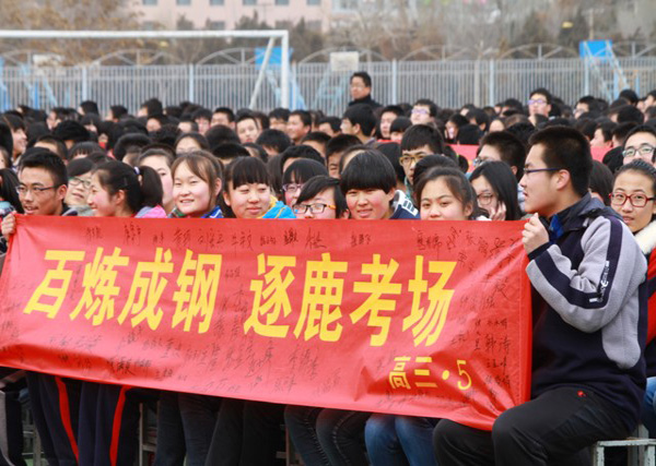 一年之計在于春,伴隨著春天的腳步和鏗鏘的旋律,擂動奮進(jìn)的戰(zhàn)鼓,吹響2014年高考的號角。2月27日下午4:00,我校在大操場隆重召開高三年級高考百日誓師大會。校長盛淑蘭,副校長魏嵋、劉興宇,政教處、高三年級部的負(fù)責(zé)人以及高三年級師生參加了大會。大會旨在進(jìn)一步激發(fā)高三學(xué)子的潛能,堅守100天的奮戰(zhàn),以積極的心態(tài)備戰(zhàn)高考。