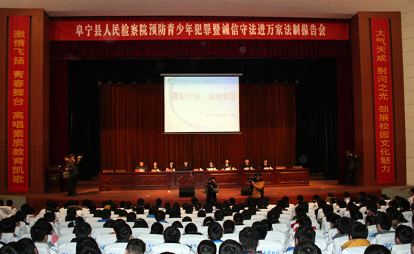 2月28日下午,阜寧中學(xué)在廣益講堂隆重舉行“預(yù)防青少年犯罪暨誠(chéng)信守法進(jìn)萬(wàn)家”法制教育報(bào)告會(huì)。由鹽城市人民檢察院公訴科陶運(yùn)梅科長(zhǎng)率領(lǐng)的鹽城市預(yù)防青少年犯罪宣講團(tuán)一行七人,給近千名同學(xué)上了一堂內(nèi)容豐富、生動(dòng)活潑的法制教育課。