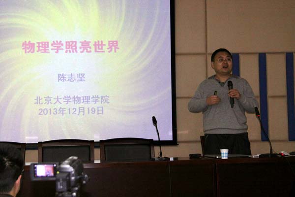 2013年12月20日上午,北京大學現(xiàn)代光學所所長,物理學院陳志堅教授蒞臨我校,在學術報告廳為高二理科實驗班、創(chuàng)新實驗班以及高三與高一部分對物理學感興趣的理科實驗班、創(chuàng)新實驗班同學作了一場題為《物理照亮了世界》的精彩講座,深入淺出地介紹了物理學發(fā)展史上影響人類的革命性發(fā)現(xiàn),倡導學生學習格物致知的精神,并展示了陳教授從事光學技術領域的最新研究成果,展望了未來科技的發(fā)展。講座后,對物理學有深入學習的部分同學與陳教授進行了長時間交流,陳教授還對我?萍紕(chuàng)新大賽參賽項目提出了寶貴的意見。部分老師也到場聽取了講座。