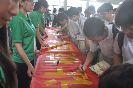 最后, 同學(xué)們?cè)凇澳阄覕y手,讓校園多一點(diǎn)綠”橫額上寫上對(duì)大自然的一句感想或祝愿語(yǔ)或簽名,以表示對(duì)保護(hù)環(huán)境的大力支持。