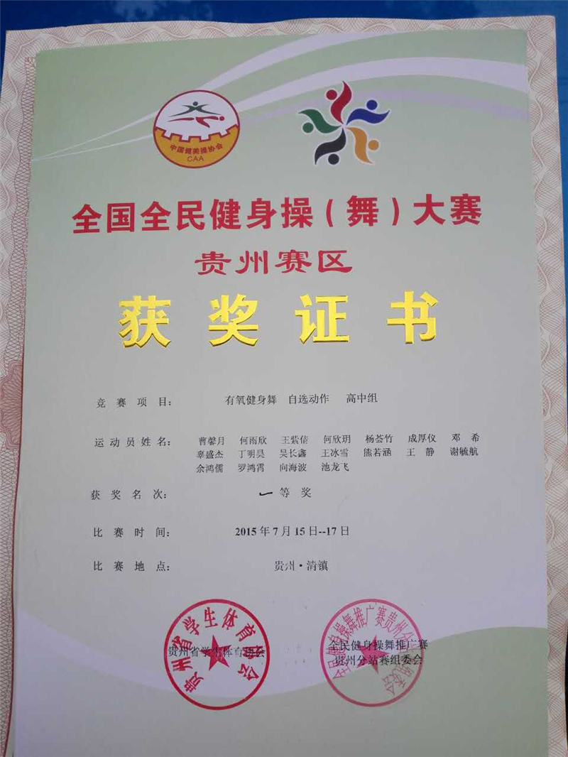 2015年7月15日~17日,在貴州清鎮(zhèn)舉行的"全國全民健身操(舞)"大賽中,我校學(xué)生代表隊(duì)獲貴州賽區(qū)一等獎(jiǎng)。