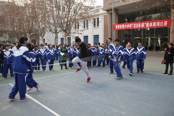 為了普及學校體育運動,增強學生體質(zhì),豐富校園生活,激發(fā)學生運動興趣,提高班集體凝聚力,展示各班的精神面貌,營造一個積極、健康、活潑、朝氣蓬勃的校園環(huán)境,貴陽六中于2013年12月4日舉行了“百日冬鍛”集體跳繩比賽。