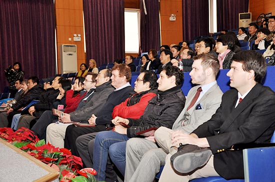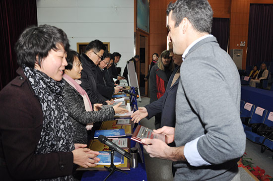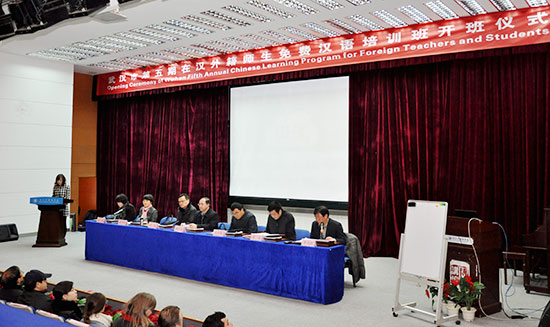 由武漢市教育局主辦,我校與英中共同承辦的“武漢市第五期在漢外籍師生免費漢語培訓(xùn)班開班儀式”于2014年元月21日下午在我校四樓報告廳順利舉行。開班儀式由武漢市教育局國際合作與交流處處長董亦頻主持。會上表彰了2013年武漢市優(yōu)秀外籍教師和先進聘外單位。武漢市教育局副局長田文江、湖北省外國專家局專家處王學(xué)剛、武漢市公安局出入境管理局外管大隊大隊長王俊和副大隊長周峻先生、我校校長李鴻朗和英中副校長姜麗為獲獎外教和聘外單位頒獎。我校優(yōu)秀對外漢語教師龍泉和她的外籍學(xué)生為大家?guī)砹艘惶妹钊M生的漢語課。儀式結(jié)束后,部分聘外單位的外籍教師對免費漢語課興趣濃厚,現(xiàn)場進行了報名。