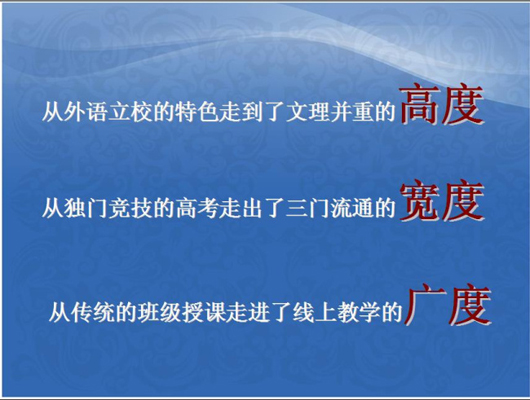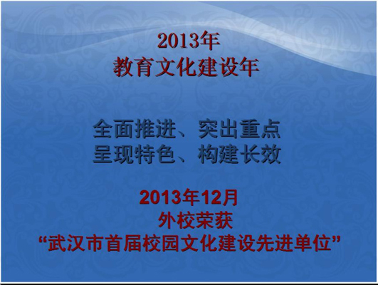 李校長以理念引領(lǐng)、制度創(chuàng)新、行為提升、課程建設(shè)、環(huán)境優(yōu)化五個部分來分享我們2013年的收獲;鼓勵全體教職員工在新的一年中,繼續(xù)以持續(xù)學(xué)習(xí)的才氣、求真務(wù)實的底氣、攻堅克難的勇氣、為民奮進(jìn)的銳氣,帶領(lǐng)全體外校人去實現(xiàn)我們的夢想。