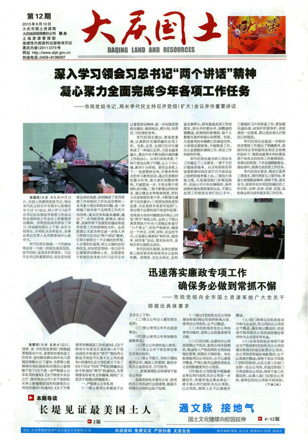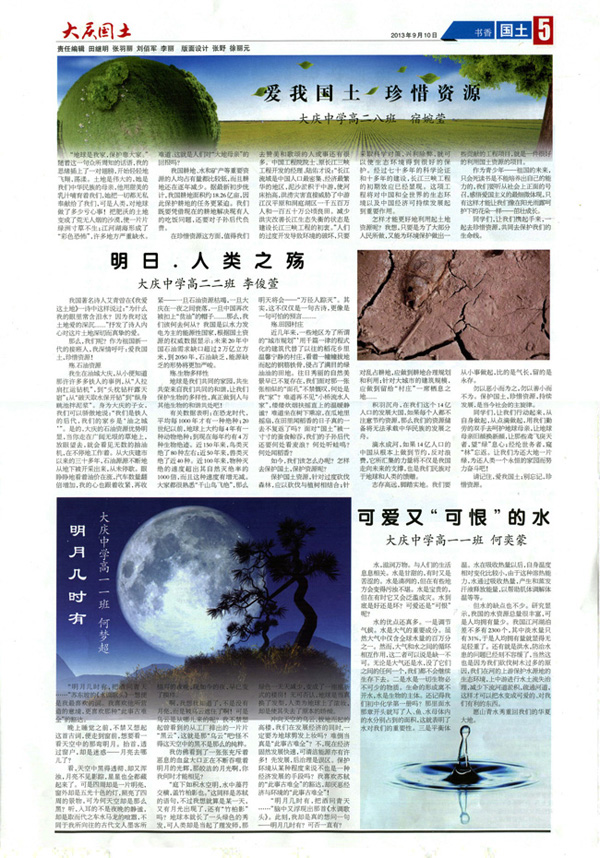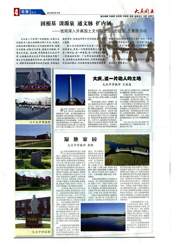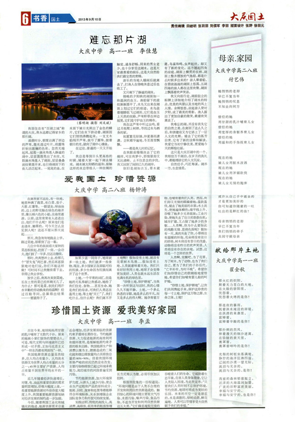 近期我校與讓胡路區(qū)土地局合作,發(fā)動廣大師生積極參與了由大慶市國土資源局、大慶油田有限責任公司聯(lián)辦的《大慶國土》報“國土文化進校園”系列活動,我校師生踴躍參加,紛紛投稿。經過層層篩選,目前已有四名教師和十名學生的詩歌、散文和書畫作品刊登在《大慶國土》報2013年第12期上。這些作品不僅從心系油城,保護環(huán)境的角度展示了大慶中學師生的藝術文學情懷,更將“為生民立命,為萬世開太平”的社會責任感和歷史使命感植根于慶中人心中。