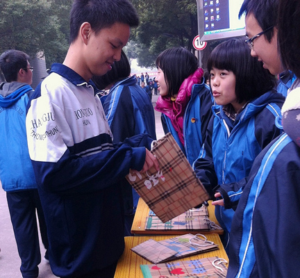 這些垃圾袋由學(xué)生會與DIY社共同合作,他們利用課余時間,完成了50個自制垃圾袋的制作,并在校門口出售。同學(xué)們對這些有著絢麗的色彩與圖案的紙袋有著濃厚的興趣,他們花一兩元買下這些小小的垃圾袋,但這一兩元花得格外值,因為正如他們自己所說:“這是在支持公益與環(huán)保!”。學(xué)生會與DIY社的同學(xué)們在制作這些紙袋時也格外用心,他們制作了老師、同學(xué)和友誼等主題的垃圾袋,吸引大量同學(xué)與老師的關(guān)注,這些垃圾袋也很快售罄,而倡導(dǎo)校園環(huán)保的橫幅也得到了大量同學(xué)與老師的簽名。