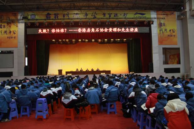該用怎樣的心態(tài)來(lái)面對(duì)人生的失?1月10日下午,香港房角石協(xié)會(huì)黃耀和先生一行來(lái)我校舉行題為《失?誰(shuí)怕誰(shuí)?》的勵(lì)志演講,他們結(jié)合自己的人生經(jīng)驗(yàn),娓娓道來(lái),細(xì)細(xì)述說(shuō)了自己生命中那些與失敗戰(zhàn)斗的經(jīng)歷,期望給孩子們精神上的啟迪與震撼,給他們傳遞出一個(gè)奮斗者的精神正能量。
