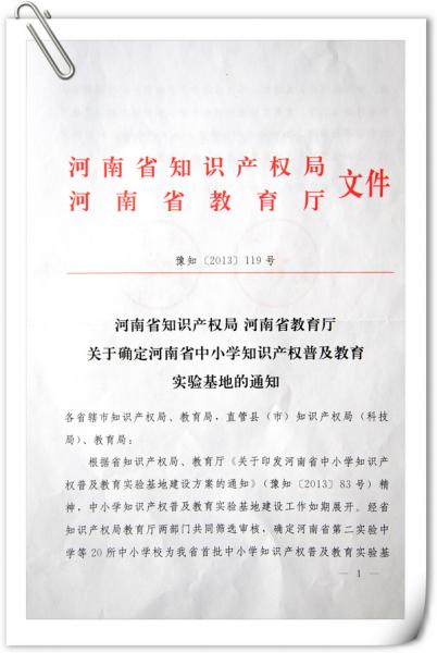 近日,從河南省知識產(chǎn)權(quán)局和河南省教育廳(豫知【2013】119號)文件獲悉:經(jīng)省知識產(chǎn)權(quán)局和教育廳共同篩選審核,確定河南省第二實(shí)驗(yàn)中學(xué)等20所中小學(xué)為我省首批中小學(xué)知識產(chǎn)權(quán)普及教育實(shí)驗(yàn)基地。