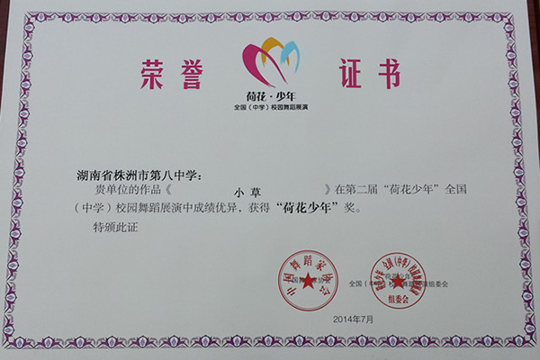 7月20日至23日,第二屆荷花少年·全國(中學)校園舞蹈展演在北京大學舉行,市八中38名學生共同演繹的群舞《小草》作為我市唯一參演舞蹈,一舉奪得金獎。中國舞蹈家協會“荷花獎”是中國舞蹈界的政府最高獎。荷花少年·全國(中學)校園舞蹈展演作為“荷花獎”的品牌系列,是中國舞蹈家協會于2013年7月推出的以中學為主的校園舞蹈展演活動。本屆展演我省僅兩個作品入圍。