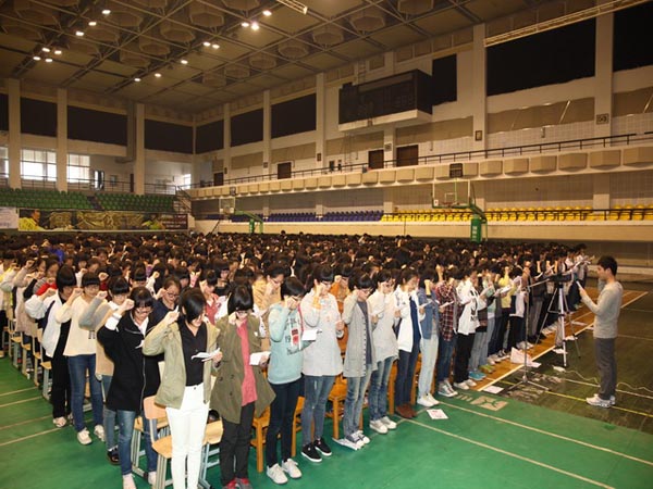 “50天我們將唱出青春無悔 ”“50天我們將笑吟12年等待”……一句句響亮的誓詞伴著一陣陣?yán)坐Q般的掌聲,回蕩在元高體藝館內(nèi),響徹云霄,激勵人心。4月17日下午,在這距離2014屆高考只有50天的特殊日子里,元高高三年級隆重舉行迎接2014屆高考五十日倒計時宣誓活動。會議由學(xué)生處陸慧菊主任主持,高三全體師生參加了本次大會。