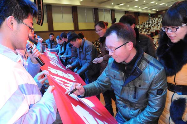 最后,22名高三班主任在誓言布上簽名,表達了必勝的信心,也為同學們遞上了最真摯的祝福!俺綁粝胍黄痫w,你我需要真心面對,讓生命回味這一刻,讓歲月銘記這一回!贝髸诟杪曋新湎箩∧。