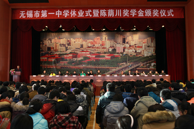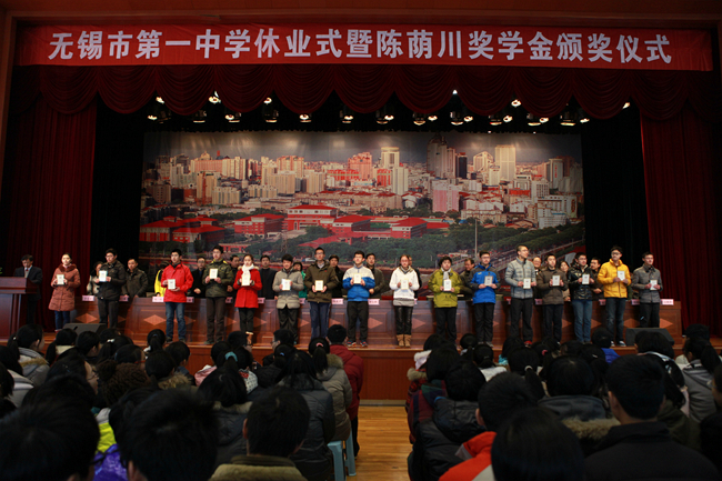 在1月23日的休業(yè)式上,無錫一中的兩千余名師生在校體育館舉行了第十三屆陳蔭川獎學(xué)金頒獎儀式。“陳蔭川獎學(xué)金”是香港長江制衣集團(tuán)的創(chuàng)辦者陳氏家族,在2001年向我市慈善會捐資500萬元人民幣設(shè)立的,定向用于獎勵無錫一中表現(xiàn)突出的優(yōu)秀學(xué)生。儀式上,無錫市學(xué)校管理中心許立新主任、無錫一中陳江輝校長、以及學(xué)校其他主要領(lǐng)導(dǎo)、五大學(xué)科主教練為獲獎學(xué)生頒獎。本次獎項分為優(yōu)秀畢業(yè)生獎、競賽獎、學(xué)年獎、優(yōu)秀學(xué)生干部獎、三好生獎,共有900余名學(xué)生獲獎,人數(shù)為歷屆之最,獎金總額達(dá)40余萬元。