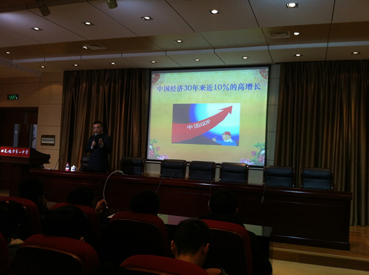 劉老師從“中國近30年內(nèi)的巨大發(fā)展及存在問題”這個話題展開,通過一幅幅圖片表明中國經(jīng)濟近三十年來呈現(xiàn)近百分之十的高增長,而隨之出現(xiàn)的環(huán)境污染等問題也越來越嚴(yán)重。劉老師以湯恩比博士的一句話引發(fā)大家的思考:“拯救二十一世紀(jì)人類社會的只有中國的儒家思想和大乘佛法”。