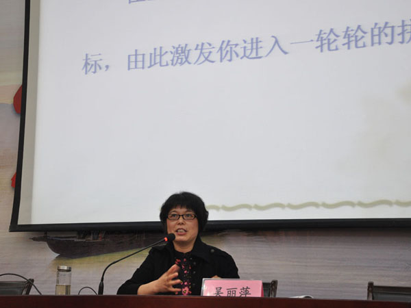 嘉興教育學(xué)院教育科研和信息處吳麗萍副處長首先從理論上闡述了生涯和職業(yè)生涯的區(qū)別和聯(lián)系,并引用大量生動典型的故事,啟發(fā)同學(xué)們樹立長遠目標(biāo),看準(zhǔn)近期目標(biāo),發(fā)揮自己優(yōu)勢,創(chuàng)造無悔人生!吧教锉尽R拉松奪冠給我們的啟示:在生涯進程中,你可以設(shè)計一個個小目標(biāo),由此激勵你進入一輪輪的新狀態(tài)!彼ㄟ^這些具體翔實的數(shù)據(jù)和案例,給學(xué)生們展示了一個個鮮活的成功者例子,闡述了生涯規(guī)劃的重要性,告訴學(xué)生“凡事預(yù)則立”的道理,并介紹了進行生涯后規(guī)劃的方法。她的講座贏得了三校學(xué)生的熱烈歡迎。