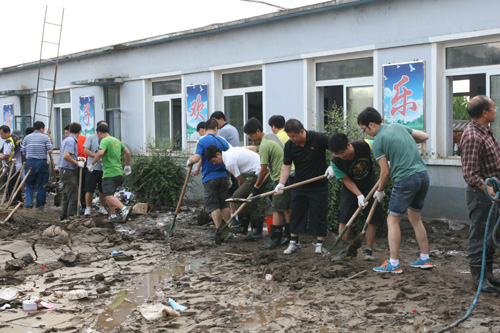 8月24日13:40,馮春和校長(zhǎng)、張珉書記、全體在校領(lǐng)導(dǎo)、中層干部以及各支部黨員共計(jì)37人,帶著抹布、拖布、笤帚、水盆等勞動(dòng)工具,再次趕到清原北三家小學(xué),進(jìn)行黨員援建義務(wù)勞動(dòng)。車子剛停下,全體黨員、干部就投入到緊張的勞動(dòng)之中。經(jīng)過(guò)大家的努力,兩個(gè)小時(shí)內(nèi),將幼兒園教室、走廊里的淤泥清理干凈并用清水徹底的清掃出來(lái);食堂的淤泥清理干凈、玻璃和地面都擦了出來(lái);甬道的硬化地面上淤泥都給清理掉。為9月1日學(xué)校能正常開學(xué)做好了必要的準(zhǔn)備。