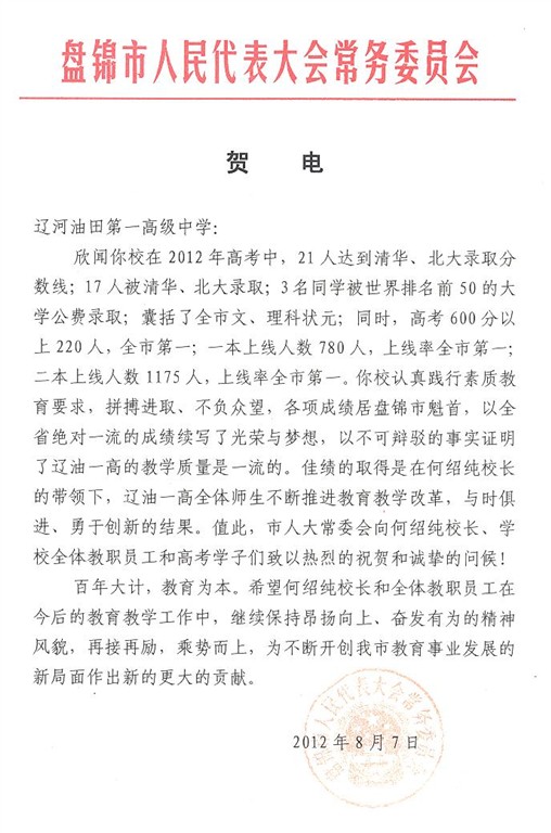 遼寧盤錦遼河油田一高— —盤錦市人民代表大會(huì)常務(wù)委員會(huì) 賀電