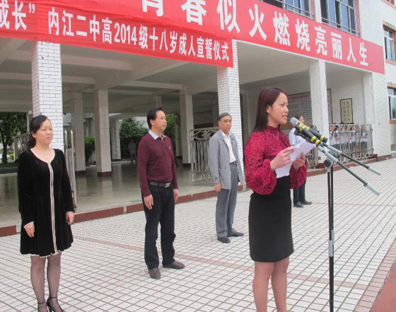 宣誓儀式在莊嚴(yán)的升國旗儀式中拉開了帷幕。陳紅妃、古月、潘鑫、葉巳榮四名同學(xué)表演了配樂詩朗誦《青春頌·中國夢》,表達(dá)了二中學(xué)子對父母、老師的理解與感恩之情,以及報效祖國的壯志豪情。高三、10班學(xué)生姜君代表成人學(xué)生在會上發(fā)言,表達(dá)了學(xué)好本領(lǐng)、報效祖國的信心和決心!斑~過成人門不僅意味著年滿18歲,更意味著責(zé)任和擔(dān)當(dāng)!庇卫虼韺W(xué)生家長向成年學(xué)生獻(xiàn)上了美好的祝愿。學(xué)校黨總支書記、校長唐昭強(qiáng)給步入成年的同學(xué)殷切寄語,希望同學(xué)們常懷高遠(yuǎn)之志、常守誠信之則、常磨苦學(xué)之劍,勇敢的面對挑戰(zhàn)和機(jī)遇、責(zé)任與使命,將個人的發(fā)展和國家的進(jìn)步緊密聯(lián)系起來,勇攀人生理想的高峰!